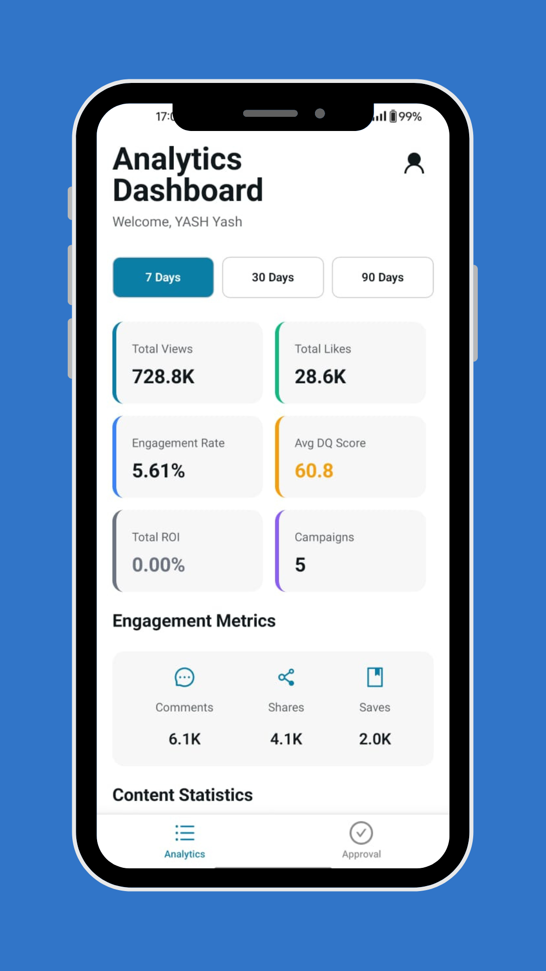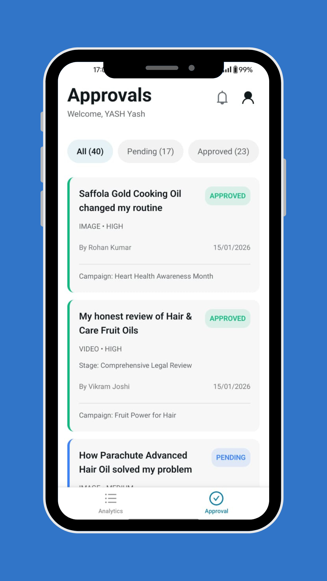Get notified instantly with iOS push notifications when content needs approval or campaigns require attention.